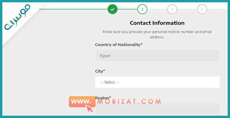 ثالثاً: في تلك الخطوة سوف يتم ظهور أمامك قائمة بها العديد من البيانات الشخصية التي يجب إدخالها لكي تقوم بإنشاء حساب، وتتمثل تلك البيانات في رقم الهاتف والاسم والمدينة والمنطقة التي تسكن بداخلها وبعض البيانات الأخرى مثل الرقم القومي.