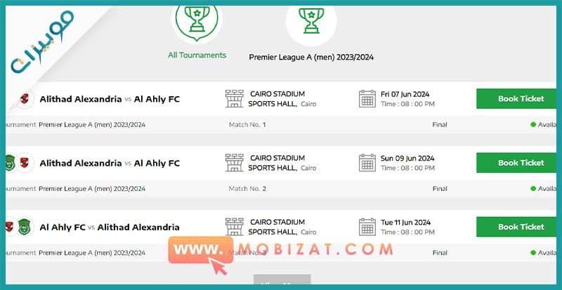ثانياً: عليك الآن أن تنتظر حتى تدخل في الصفحة التالية والتي ستجد بداخلها جميع مباريات الدوري المصري القادمة بالمواعيد وأمام كل مبارة خيار تحت عنوان Book Ticket فقم بالنقر عليه.